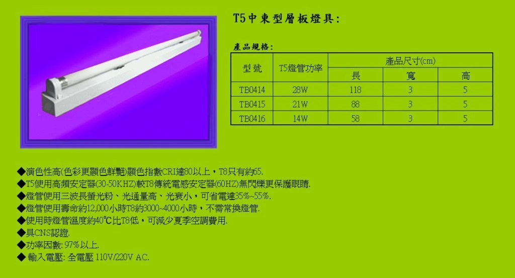 T5三基色節能日光燈管是最近幾年才發展起來的,最初是2003由飛利浦引進的,由於其具有光效高,壽命長,省電的優點,迅速地被市場接受。但由於當時價格太高,所以限制了其在照明燈具的銷售市場。近年來一些生產技術的進步,價格合理了,自然也就開始廣泛應用了。T5節能日光燈是最適合代替普通T8/T9日光燈的,而且隨著全球石化燃料的價格不斷上漲,電價也隨著必然上漲,T5燈具代替T8日光燈是大勢所趨。